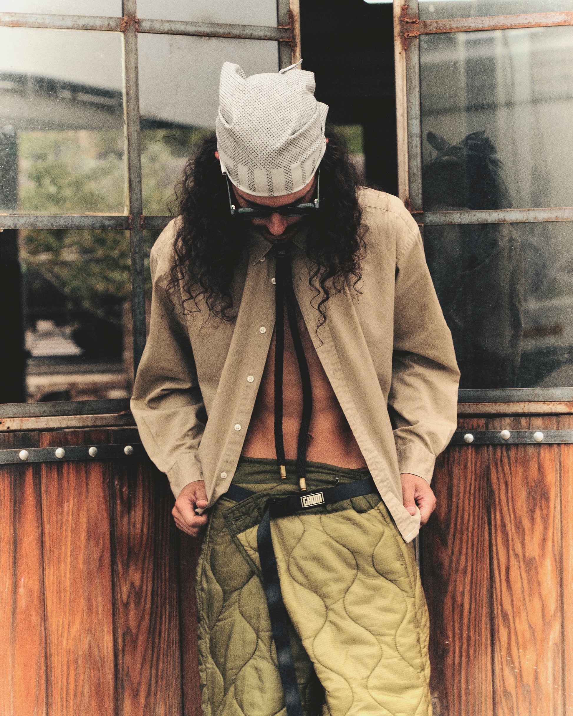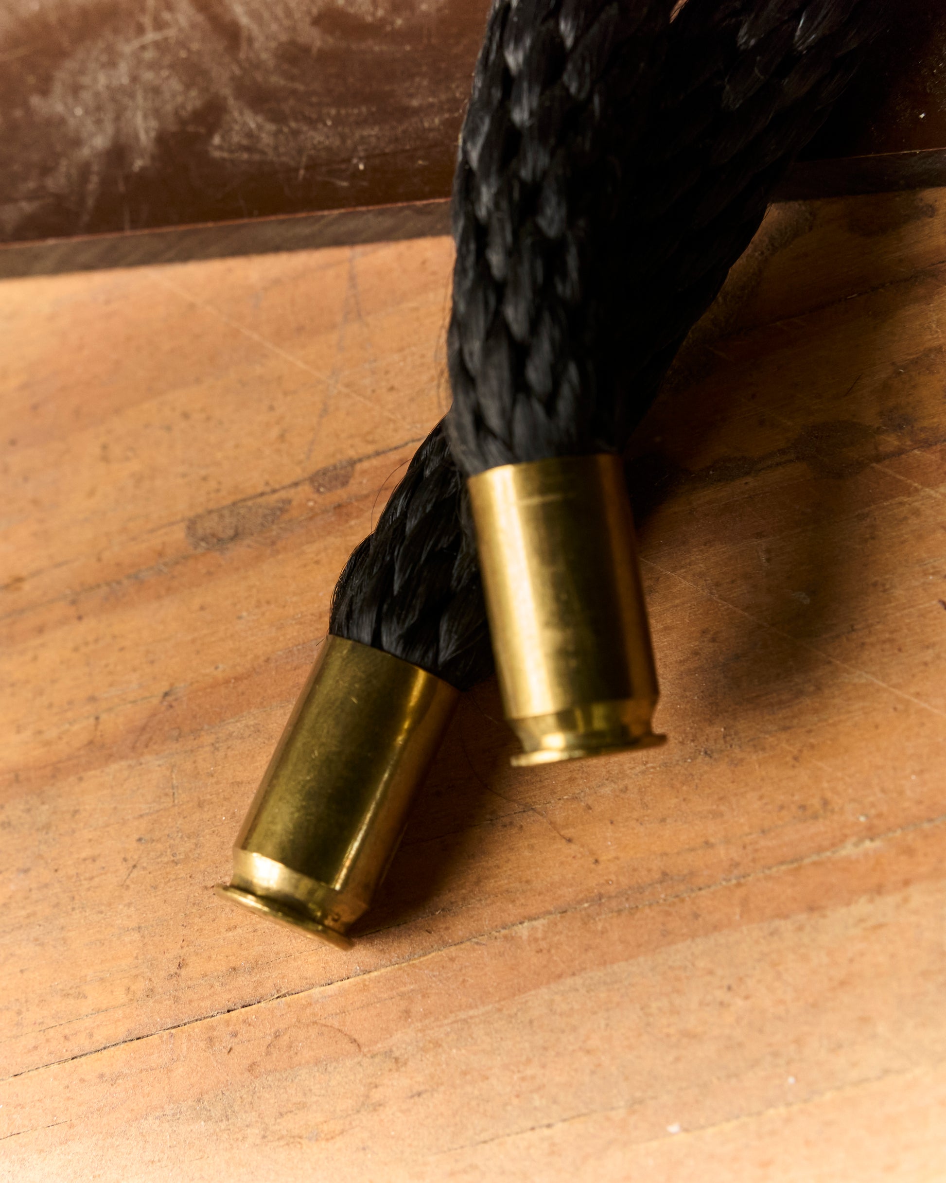 Raw work rope combined with a laser engraved steal fastener and two used .45 caliber bullet shells to give you the statement piece you needed for your wardrobe.
