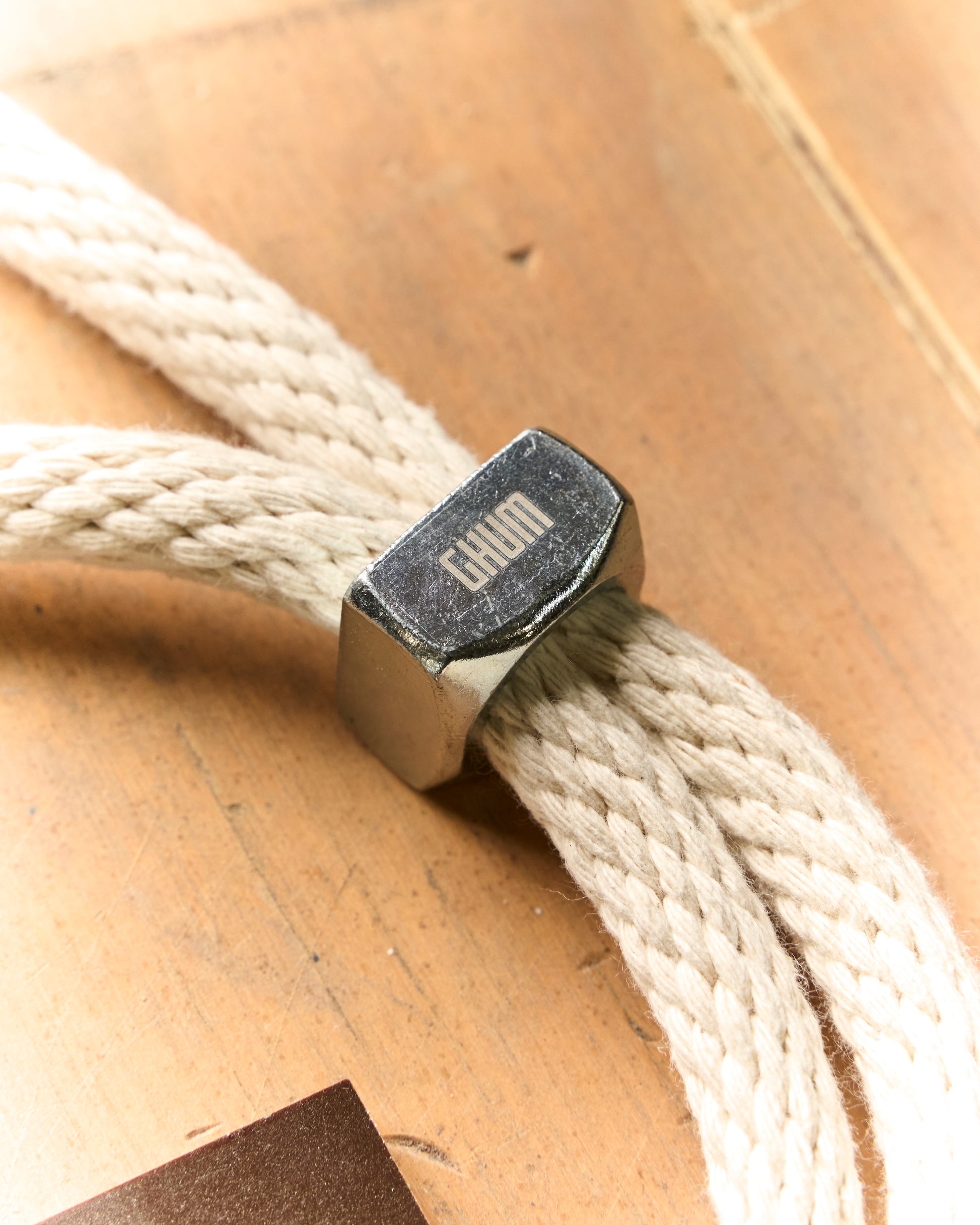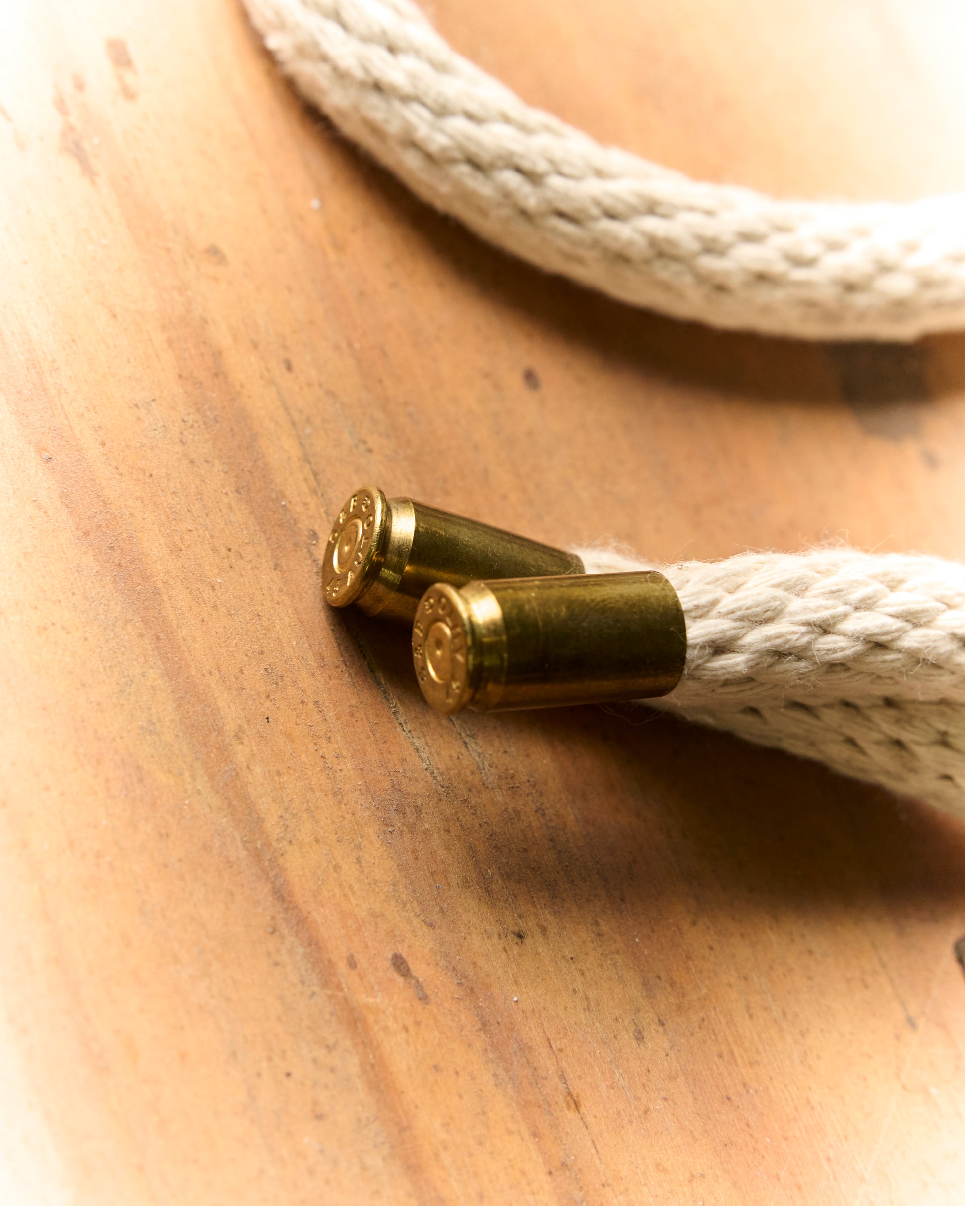 Raw work rope combined with a laser engraved steal fastener and two used .45 caliber bullet shells to give you the statement piece you needed for your wardrobe.